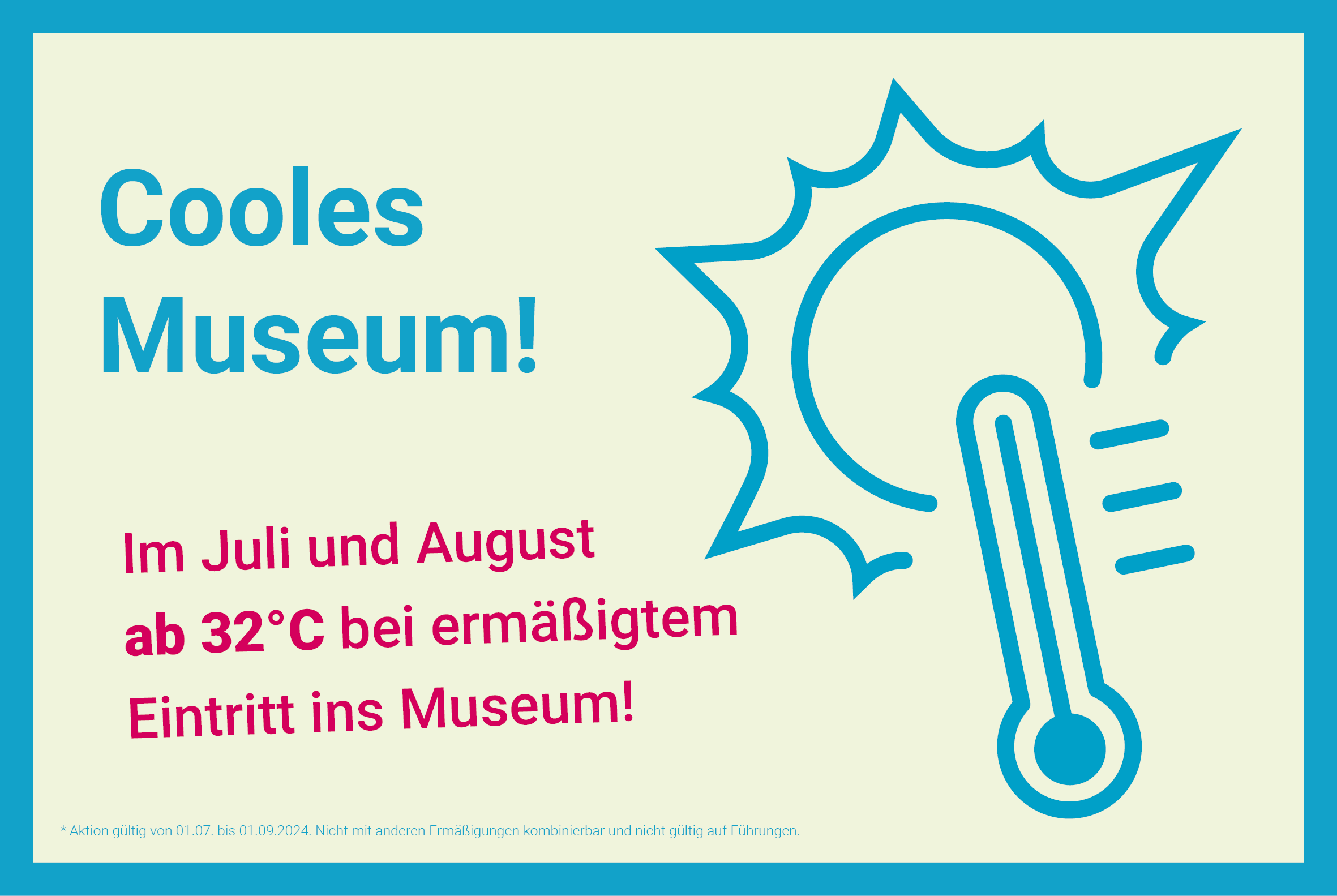 An der Museumskasse einfach das Codewort »Cooles Museum« nennen und ermäßigten Eintritt erhalten. Die Aktion ist gültig von 01.07. bis 01.09.2024. Nicht mit anderen Ermäßigungen kombinierbar und nicht gültig auf Führungen.