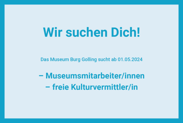 Das Museum Burg Golling sucht ab 01.05.2024 zwei Museumsmitarbeiter/innen für den Besucherservice an der Museumskasse und eine/n freie/n Kulturvermittler/in. Alle weiteren Informationen unter: www.museumgolling.at/ueberuns/stellenangebote.