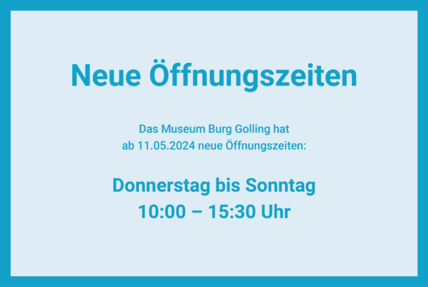 Am Sonntag, 26.05.2024 findet wieder das »Salzburger Museumswochenende« statt, an dem zahlreiche Regionalmuseen im gesamten Bundesland Salzburg ihre Türen öffnen. Auch das Museum Burg Golling wird an diesem Tag geöffnet sein und wird zwei Sonderführungen anbieten. Das Museum Burg Golling ist am »Salzburger Museumswochenende« von 10:00-17:00 Uhr geöffnet. Um 10:30 Uhr findet eine Führung durch…