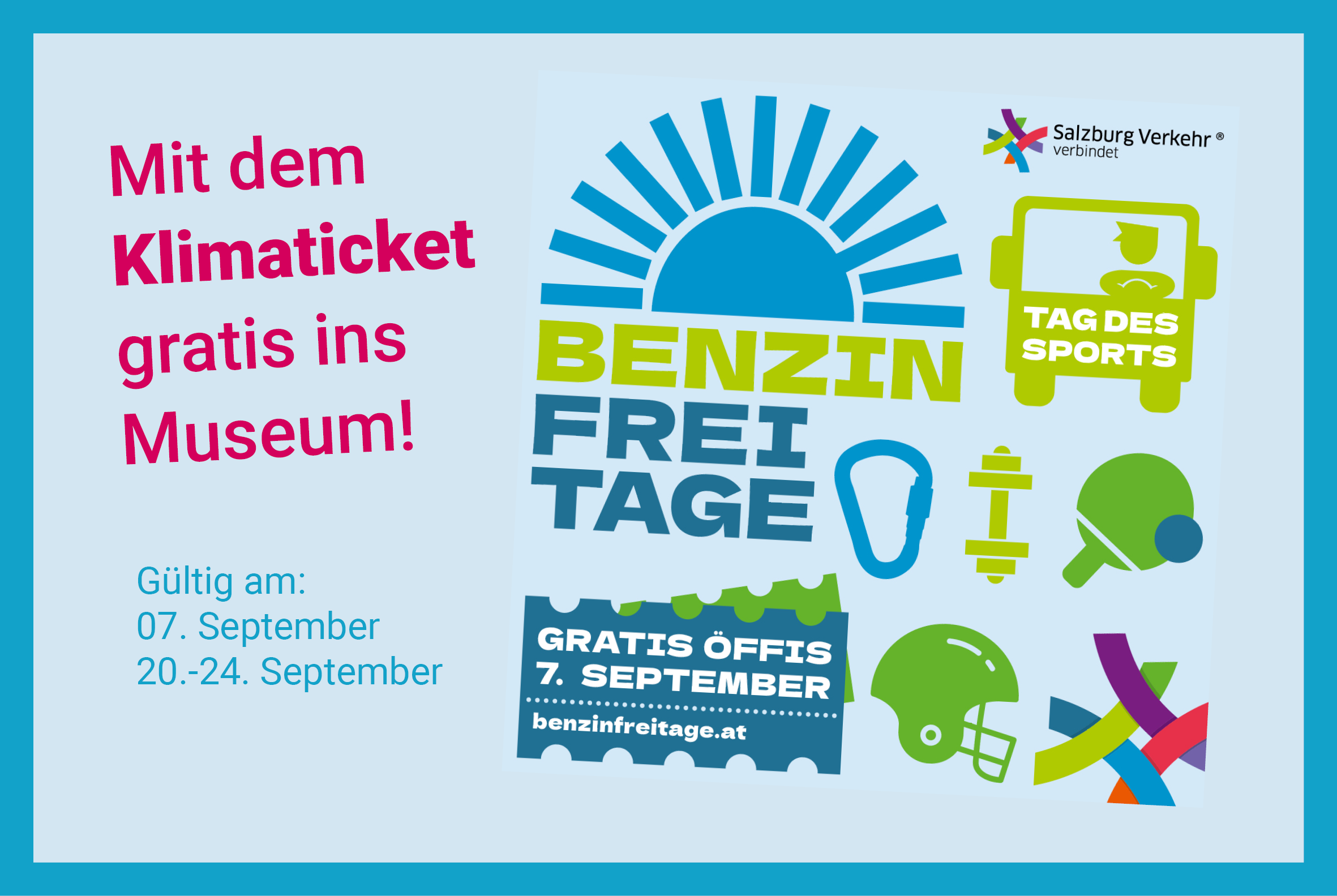 Im Rahmen der »Benzin-Frei-Tage« können die Besitzer/innen von Klimatickets und Jahreskarten des Salzburger Verkehrsverbundes in ausgewählten Tagen im September kostenlos zahlreiche Museen im Bundesland Salzburg besuchen – unter anderem auch das Museum Burg Golling. Die Aktion gilt am 07.09. sowie von 20.09.-24.09.2024 und ist eine perfekte Möglichkeit für einen nachhaltigen Museumsbesuch mit umweltfreundlicher Anreise in öffentlichen Verkehrsmitteln.