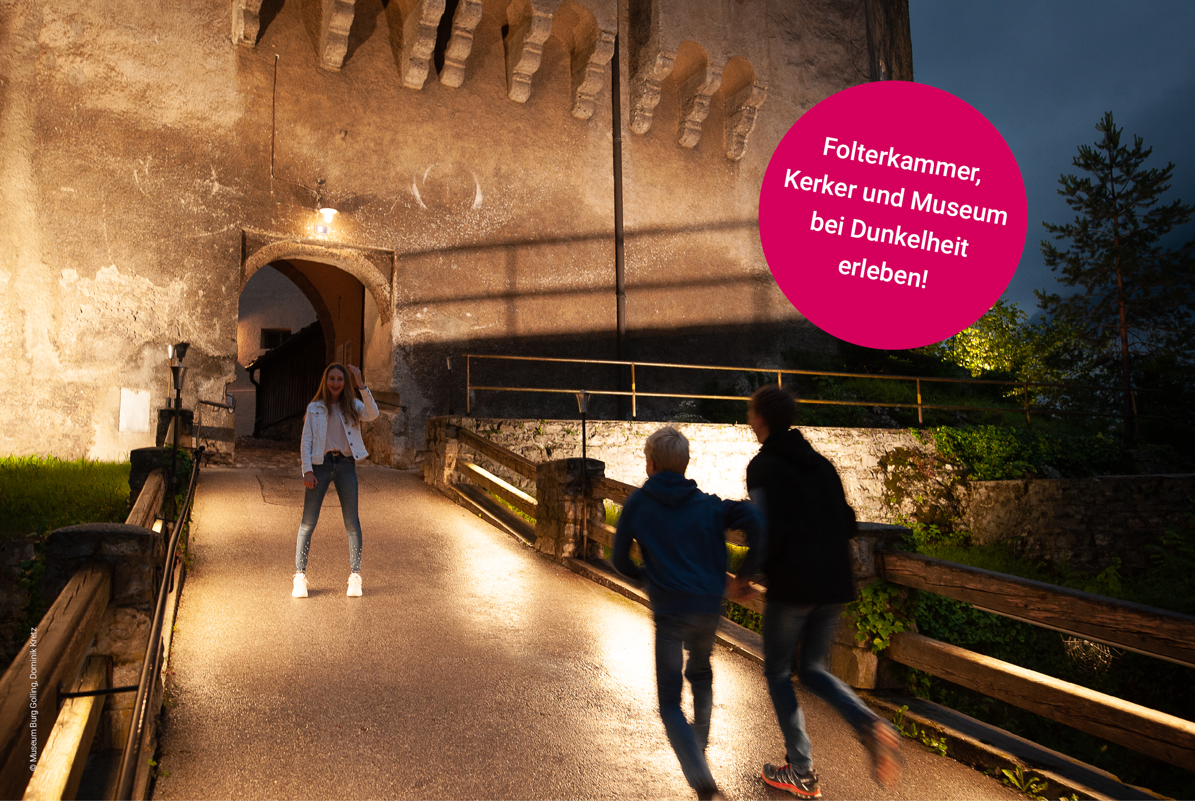 Termine: Mittwoch, 12.07., 26.07., 23.08., um 20:00 Uhr. Keine Anmeldung erforderlich. Taschenlampen werden bereitgestellt. Weitere individuelle Führungstermine sind auf Anfrage für Gruppen jederzeit möglich. Weitere Infos unter: www.museumgolling.at/besucherinfo/fuehrungen/