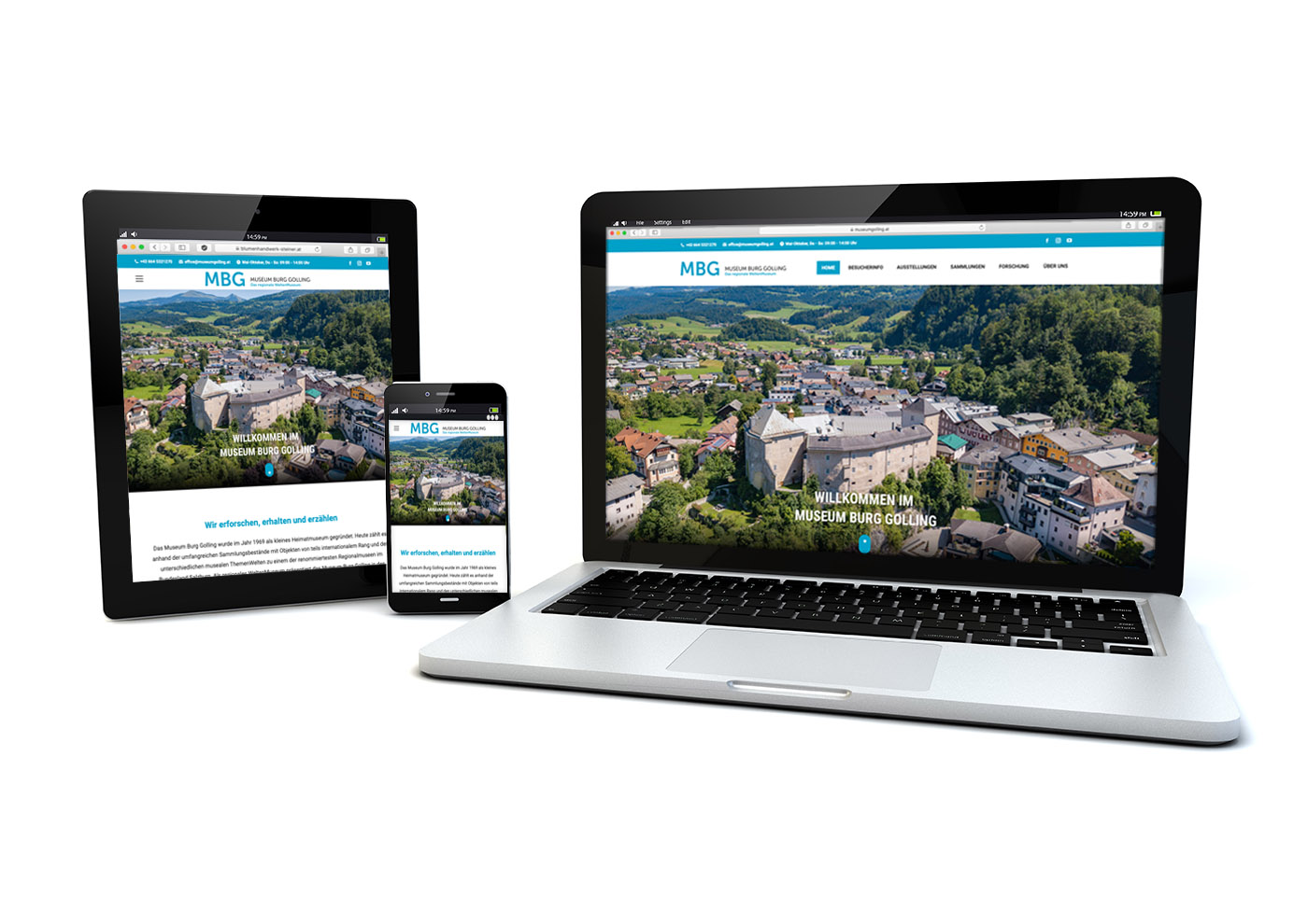 In hervorragender Zusammenarbeit mit der Werbeagentur Monika Ellmer aus Golling wurde auf der Grundlage des Corporate Designs auch ein neuer Webauftritt (www.museumgolling.at) realisiert. Die neue Web-site ist dabei vollständig responsive und somit – neben der Nutzung auf einem Computer – auch für die Betrachtung auf mobilen Endgeräten wie Smartphones oder Tablets optimiert. Die Website bietet Besucher/innen alle wichtigen Informationen über die Öffnungszeiten, das Führungsangebot und über die aktuellen Sonder- und Dauerausstellungen. Neben einem informativen Überblick über die Sammlung und die Forschungsprojekte des Museums, werden auch das Museumsteam, der Wissenschaftliche Beirat sowie der Förderverein vorgestellt. Zudem können sich Besucher/innen auf der Website für den neuen Newsletter anmelden, um stets aktuelle Informationen aus dem Museum Burg Golling zu erhalten.